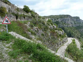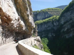 Nachdem wir auch den Col de la Maschine (1011 m) passiert hatten, tat sich die mit Worten kaum zu beschreibende Szenerie der "Combe Laval" auf: Die Straße wurde schmal und führte direkt an der viele 100 m senkrecht abfallenden Kante des Berges entlang. Stellenweise bohrte sie sich in Tunnels durch den Fels, um gleich danach wieder hervorzutreten und unter Felsüberhängen und -bögen hindurch der Abbruchkante des Berges zu folgen. Hinter fast jeder Biegung gestaltete sich ein neues Panorama. Oft hielten wir dort, wo die Straße etwas breiter war oder Ausweichstellen vorhanden waren an, um Fotos zu machen oder einfach nur um den Blick steil hinunter zu genießen. Das muss man einmal gesehen oder besser noch gefahren haben (Video)!